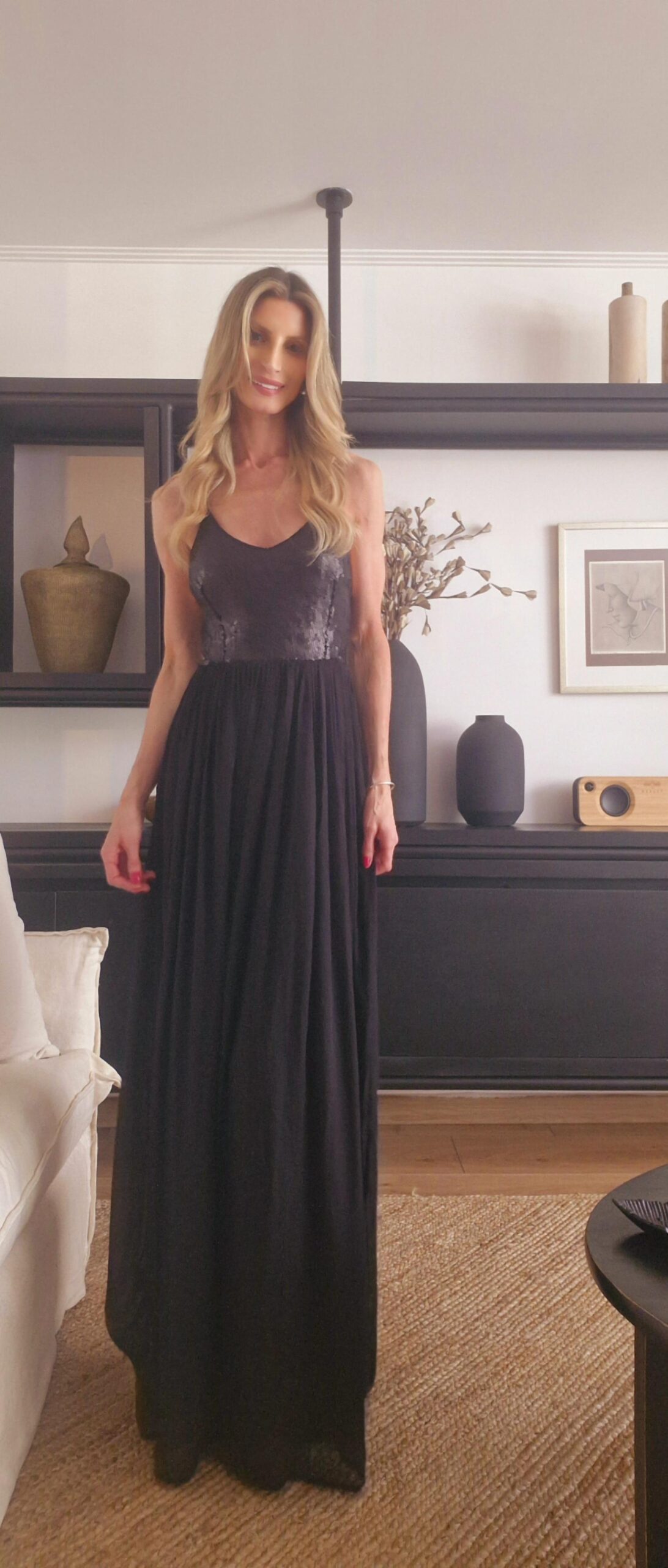 VESTIDO ESCOTE EN V CON LENTEJUELA Y FALDA DE SEDA TIPO GASA ,ESPALDA EN V